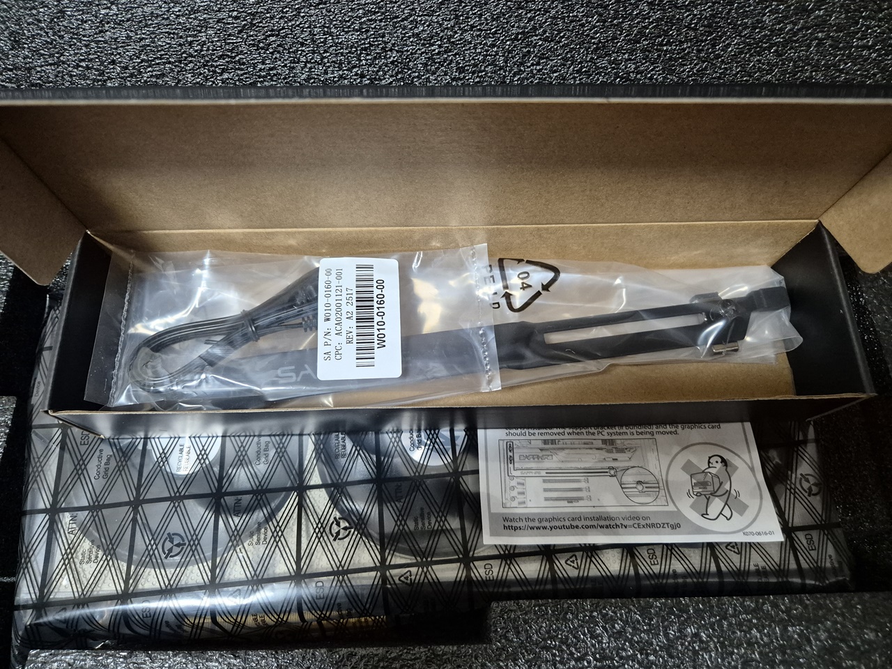 박스를 열면 RX 9060 XT Nitro+와 액세서리(지지대, ARGB 5V 3핀 케이블)가 들어 있다.